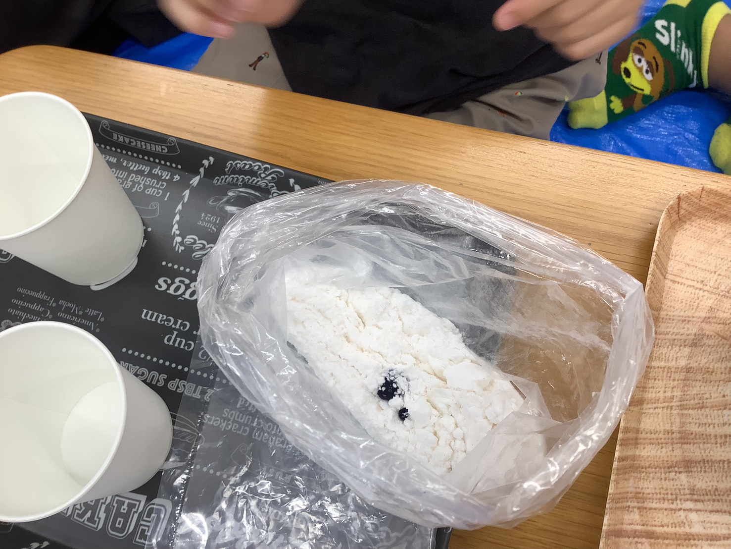 量った材料を袋に食紅を入れて振った後に固めると・・・・