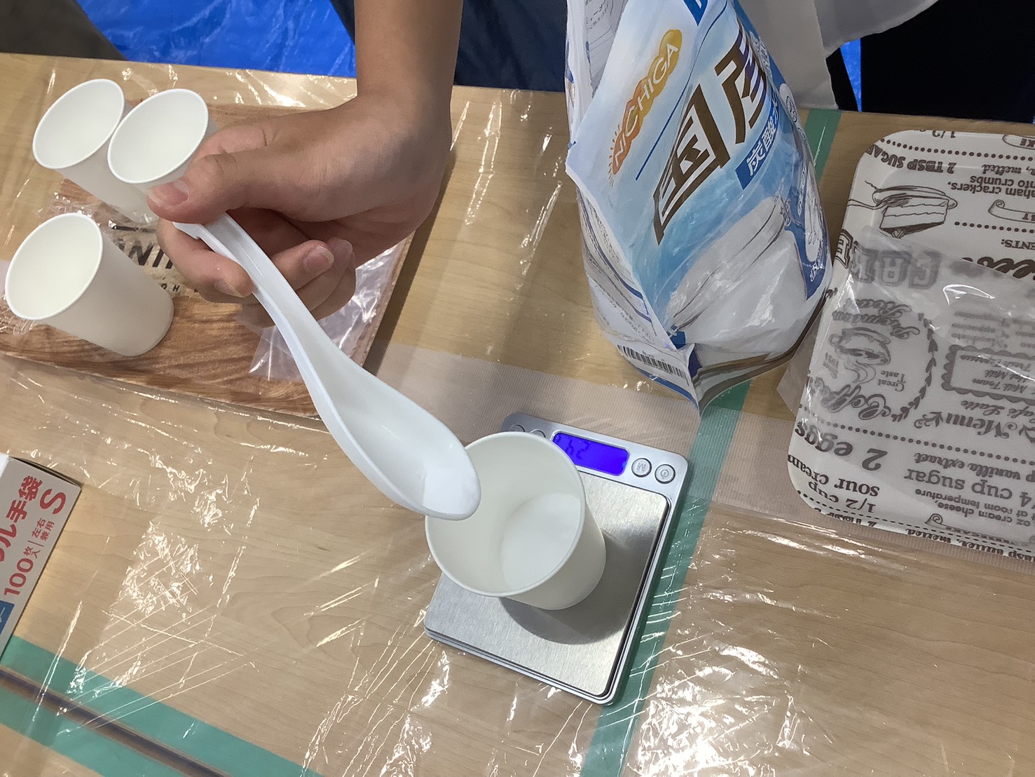 ペアを組んだメンバーと「あと何グラム!、ちょっと超えた!」と言い合いながら指定されたグラム数を各カップに入れていました( ^^) _旦~~
